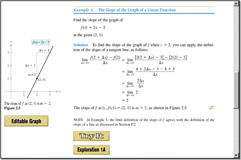 Example screens present worked-out solutions to calculus problems. Each Example is accompanied by a Try-It and its solution, and at least one Exploration, which allows you to further investigate the calculus presented in the Example.