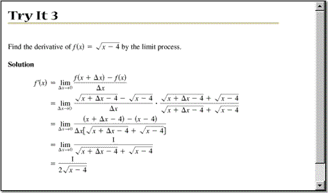 For each Example, you have the opportunity to solve a related Try It problem to reinforce the calculus of the Example. You can also view the solution to the Try It to see whether you solved the problem correctly.