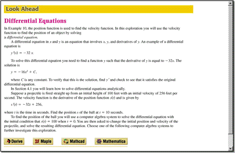 Look Ahead topics give you a glimpse of material to come, by allowing you to use one of four computer algebra systems Derive™, Maple®, Mathcad®, and Mathematica® to investigate upcoming calculus concepts.