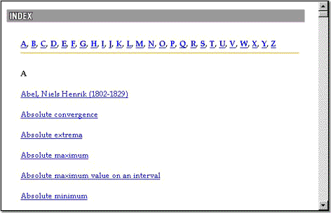 The Index contains a list of important calculus terms that are covered in Interactive/Internet Calculus 3.0. You can link to the beginning of the Concept in which a particular term is introduced.